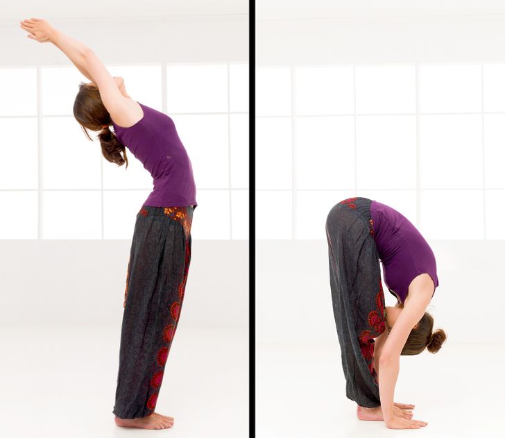 Bend slowly downward as far as you can. Push out as much air as possible from your lungs. Return to the initial position. Inhale.