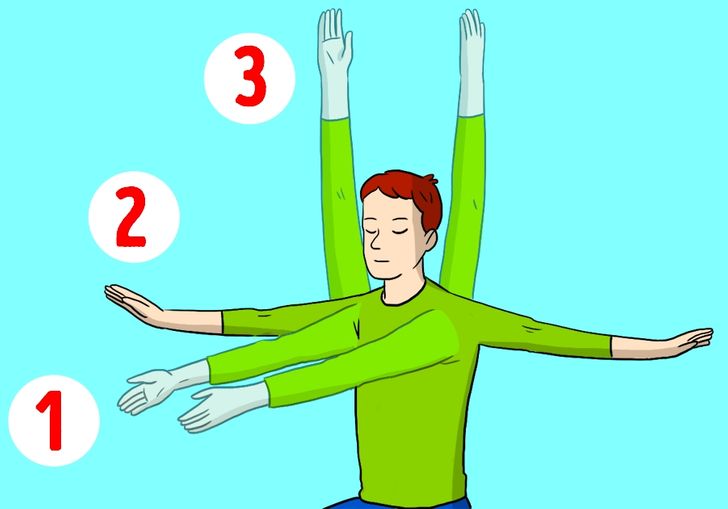 Inhale while lifting your arms and placing them in front of you. Breathe out.Inhale while moving your arms to the side and keeping them at shoulder level. Exhale.Inhale while lifting your arms up over your head. Exhale.Return to the initial position.