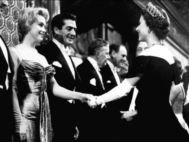 In 1956, Marilyn Monroe greets Queen Elizabeth II.