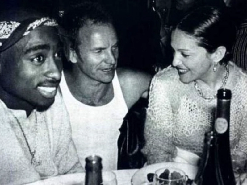 Tupac Shakur, Sting, and Madonna are shown meeting in the picture.
