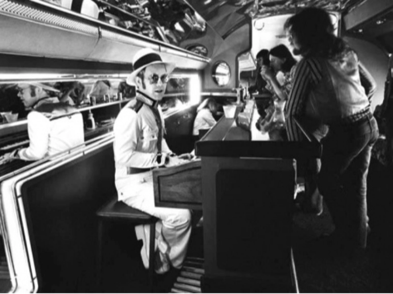 A 1976 photo shows Elton John playing the piano while boarding a private plane.