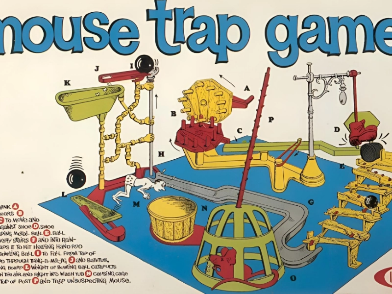 Mouse Trap is a game of complex mechanics and humorous strategy that was first produced by Ideal Toy Company in 1963. Its Rube Goldberg-inspired apparatus captivates players. During the game, players build the famous trap piece by piece and then manoeuvre their mice over the board, collecting cheese along the way.