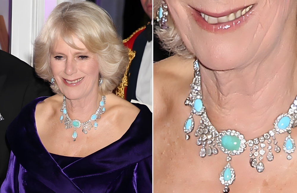 The Queen Consort was spotted wearing this diamond and turquoise set in 2012 during an award show at the Imperial War Museum in London. This brightly-colored set includes a pair of earrings and a matching necklace – it is quite different to Camilla’s usual jewelry. The necklace features diamonds and clusters of turquoise and its most unique feature is the diamond fringing.