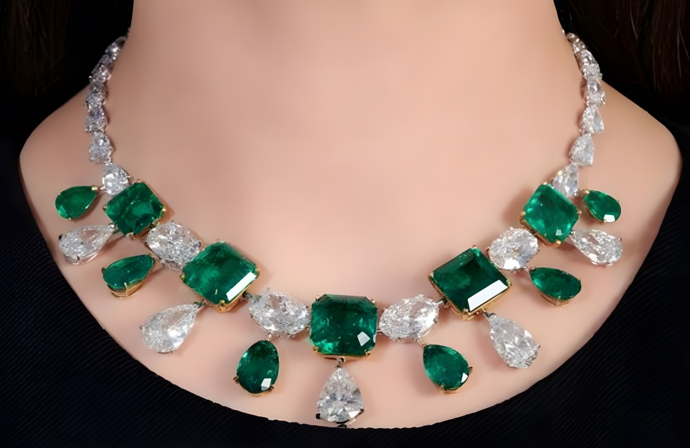 It boasts a magnificent 75.63-carat emerald pendant, delicately suspended from a chain glittering with diamonds and smaller emeralds. Worth around $6.5 million, this opulent piece tells tales of royal patronage and an enduring love for precious gemstones that’s been passed down through generations.
