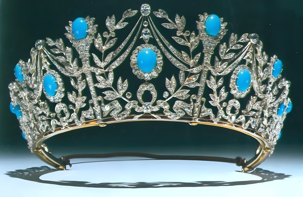 The tiara’s fascinating blend of cushion-shaped turquoise cabochons and rose-cut diamonds forms an enchanting tableau of floral and bow motifs, echoing a bygone era of royal extravagance and timeless elegance.