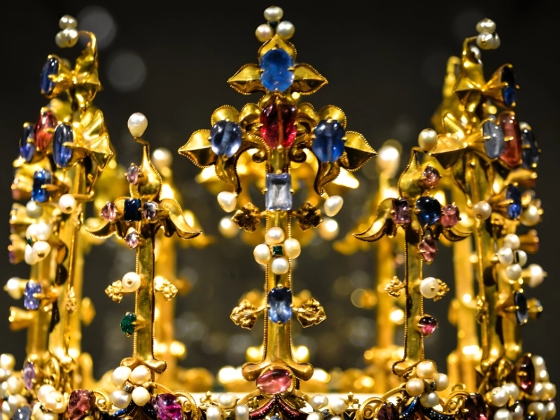 With a history dating back to 1370, the Palatine Crown—also known as the Crown of Princess Blanche—is the oldest royal crown to have existed in England. The Royal Residence Treasury in Munich is home to the Palatine Crown, which is crafted from diamonds, gold, rubies, emeralds, enamel, sapphires, and pearls.