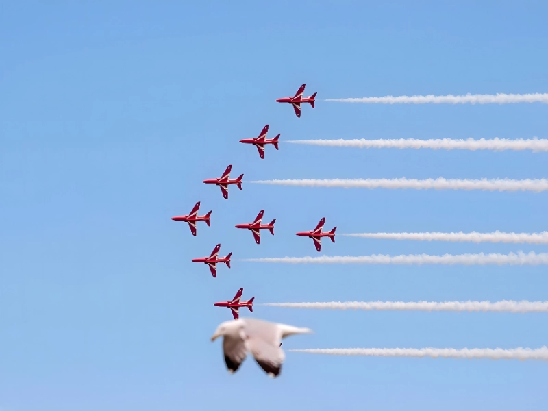 This picture was taken by Miss Jaded, who shared it on her website for amusement. Who knew that birds could soar at such high speeds? They can, because of the power of forced perspective. Eight red planes are seen flying across the sky in this picture. A bird that occurs to fly by and happens to come into the picture at the exact wrong (or right, depending on your perspective) moment obscures the ninth.