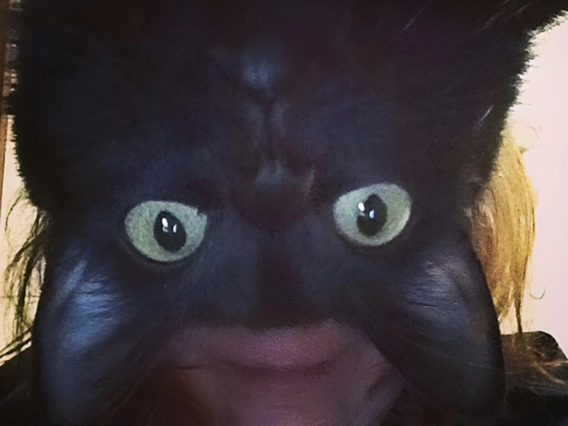 Cats enjoy taking pictures of us when they’re least expected. This woman was obviously attempting to snap a straightforward selfie, but her black cat had other ideas. He leaned his enormous head over the camera to obstruct the image and give it the appearance of a cat-human hybrid.