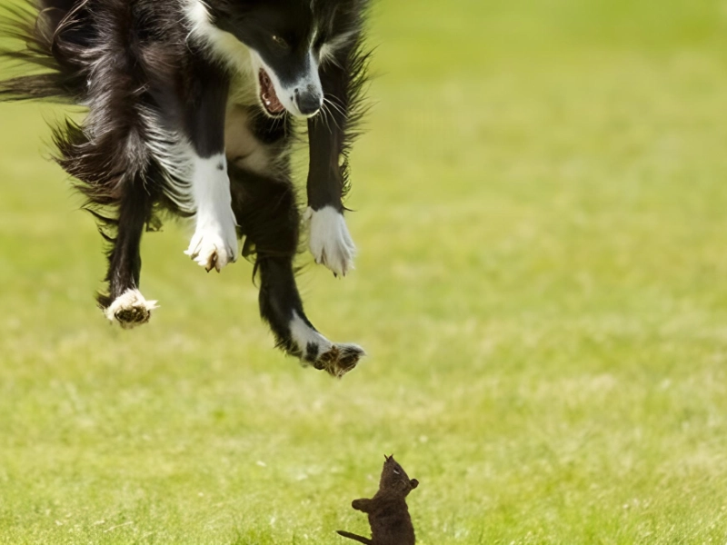 Dogs, ah. When they’re barking at the mailman or an Amazon delivery person, they can be so fearless and fierce, but the slightest movement or sound will make them whine. This timid dog sprang several feet into the air upon discovering a toy mouse, which he had most likely left in the yard and forgotten about.