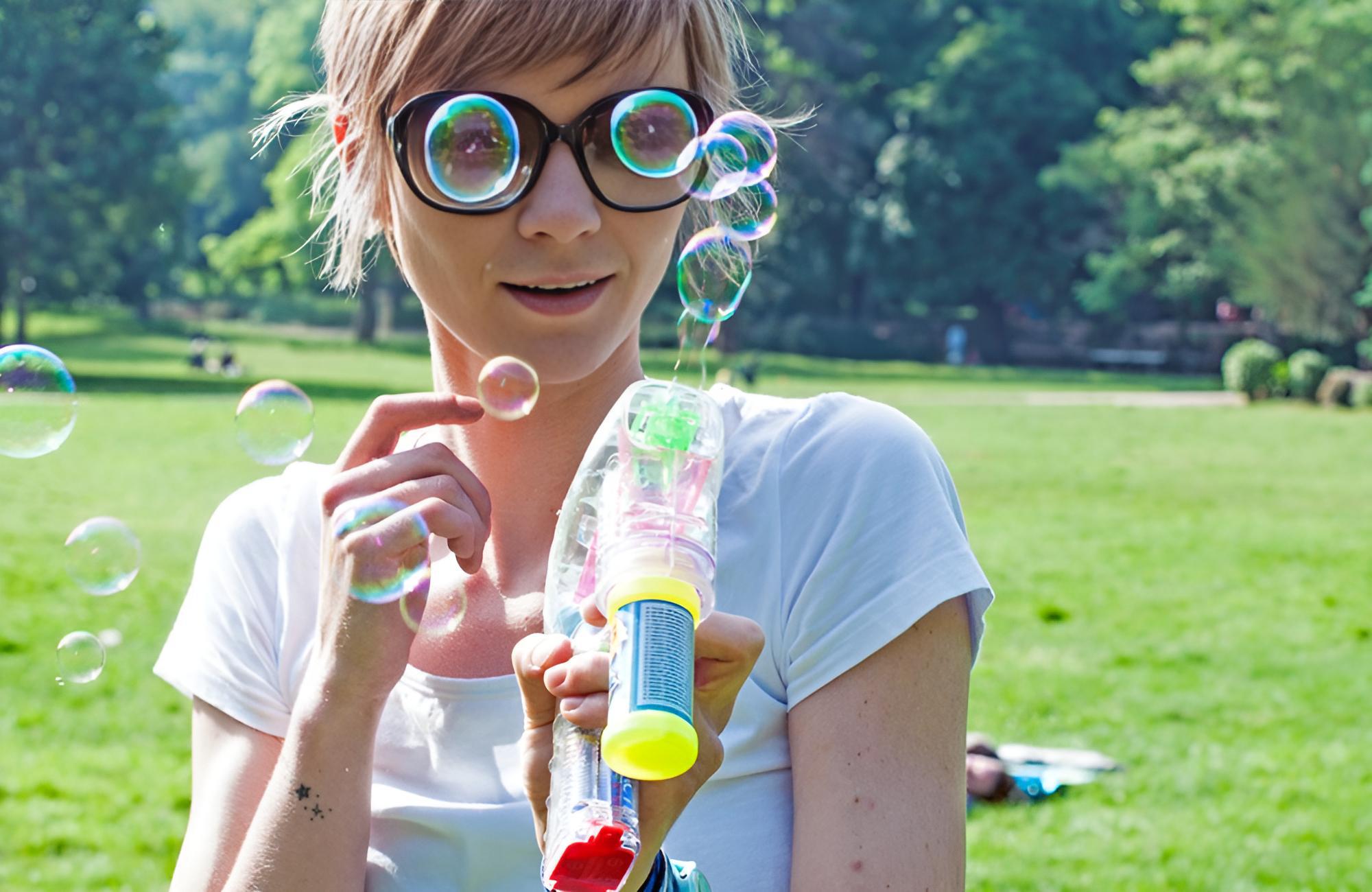 This photo makes this bubble-blower look as though she is wearing a pair of bubbles for glasses. This photograph is crystal-clear, and we love the way you can see the inimitable rainbow coloring of the bubbles as they float upward.