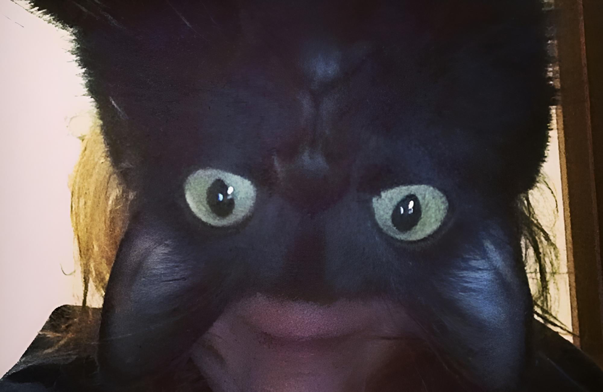 Cats love to photobomb us at the most inopportune times. This woman was clearly trying to take a simple selfie, but her black cat had better ideas, leaning his giant head over the camera to block the shot and turn the photo into one of a human-cat hybrid.