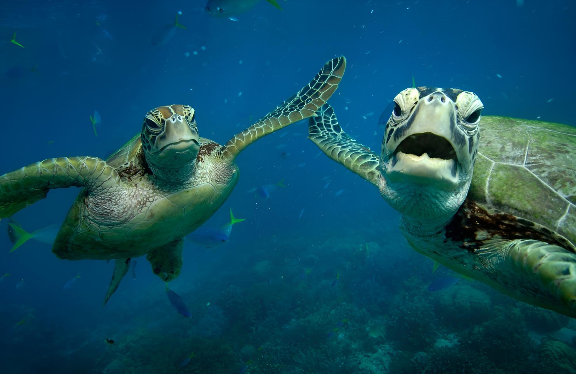 Sea turtles are our friendly marine friends who cruise through the ocean peacefully. There are seven existing species of these precious creatures, and seeing photos like this is a reminder of why we need to fight harder to keep their natural habitats—the oceans—clean. In this photo, captured underwater, two beautiful sea turtles are seen seemingly giving each other a “high five” with their flippers.