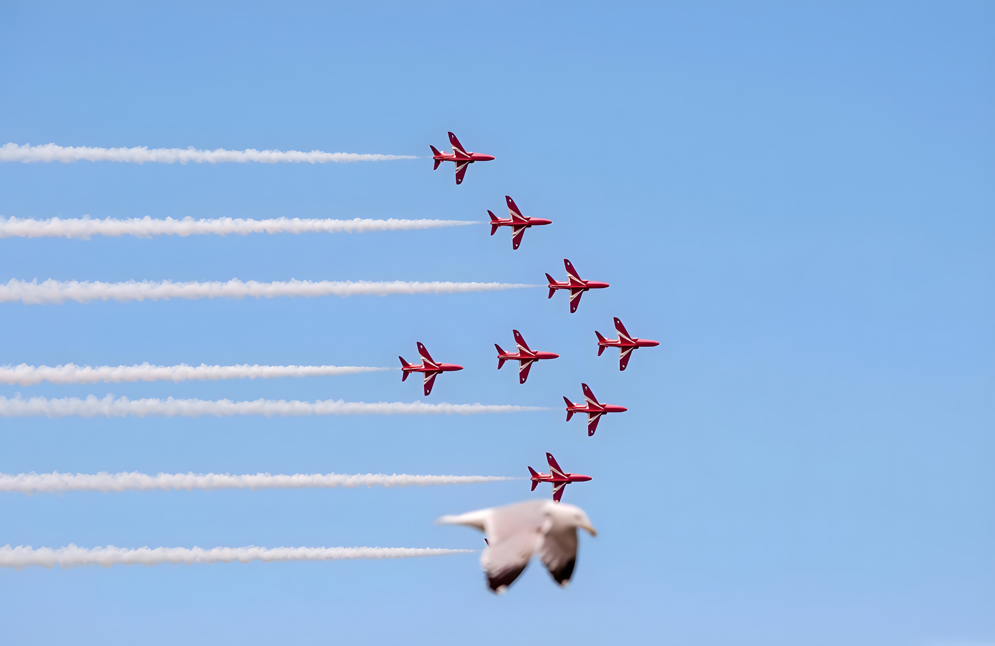 Miss Jaded took this photo, posting it to her website for a laugh. Who knew that birds could fly super-fast? Thanks to the power of forced perspective, they can. In this photo, eight red planes are cruising through the sky. The ninth is obscured by a bird passing by who happened to get in the shot at the wrong (or right, depending on how you look at it) moment.