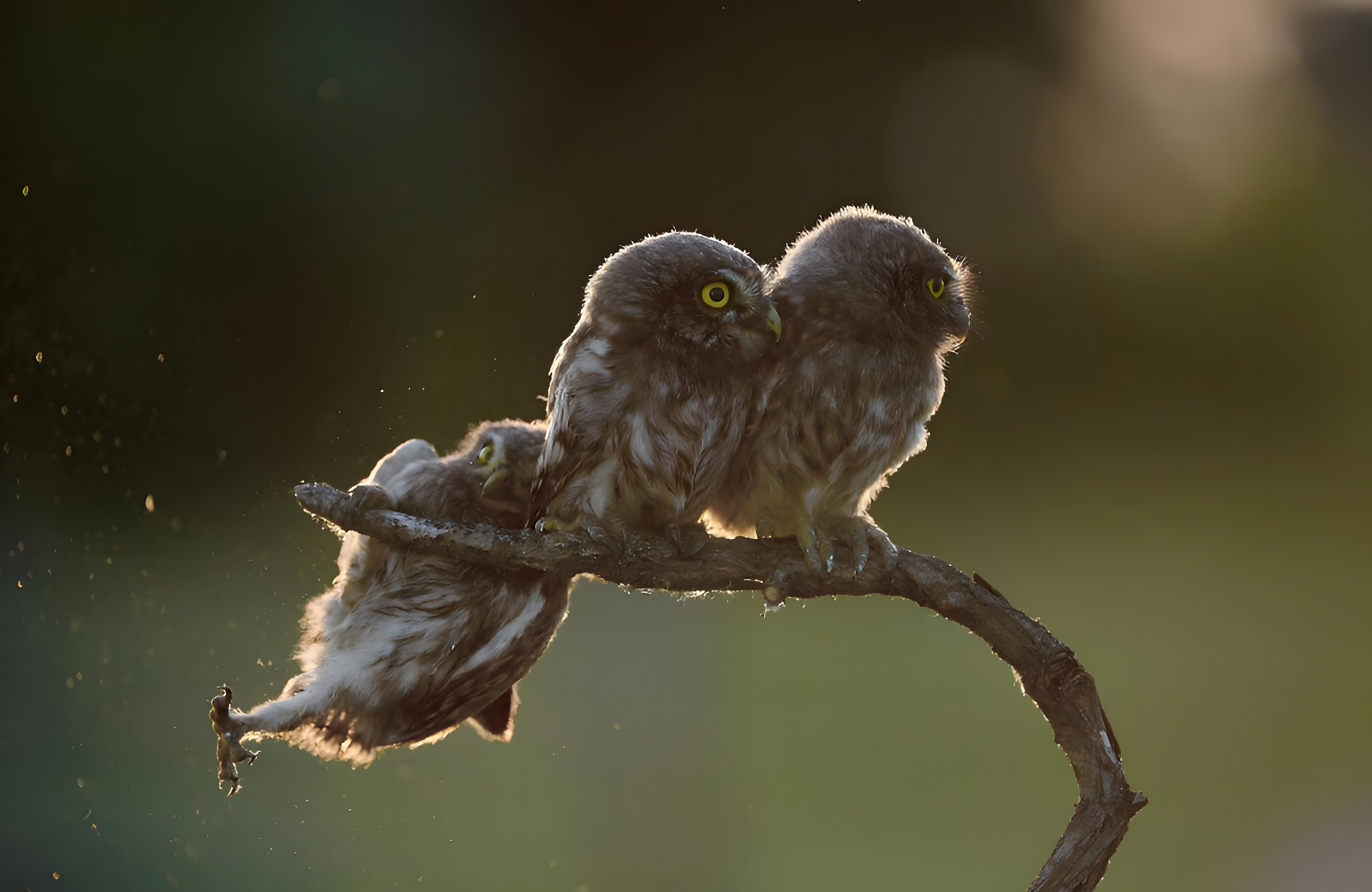 These fluffy little owls are adorable, and they’re trying quite hard to stay on the branch. Two of the three are perfectly poised, but the third can’t seem to manage, as he is hanging by a thread. This is the owl version of pull-ups, and we hope he doesn’t fall.