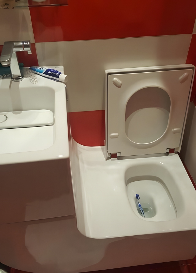 What started out as a cheap way to build a sink and a toilet together, quickly slid out of control (pun intended). Imagine putting your toothbrush down on your sink for just a moment, thinking it is perfectly safe, only to turn your back for an instant and see it sliding quickly right into the toilet bowl. It was too late to save it and now nothing is safe from the sink slide.