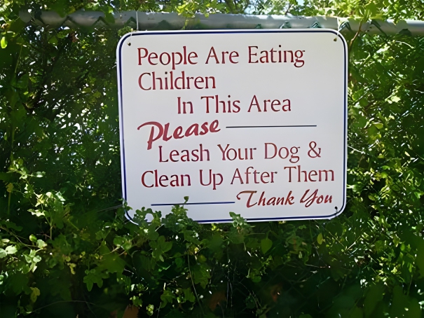 Instead of buying multiple signs to explain the different possibilities of what is going on in this town, why not just buy one? And on that one you can put all the possible warnings you can think of…into one big mess of a statement that makes absolutely no sense. It’s the perfect way to keep your neighborhood safe if you like to confuse your potential threats into fear and retreat.