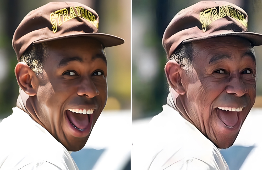Thirty-year-old rapper Tyler the Creator looks three times his age in this FaceApp creation. The chart-climbing artist, in this edited photo, has gray hairs, yellower teeth, and way more wrinkles. The musician is also a very prominent visual artist, so he probably greatly appreciated the realistic nature of this FaceApp’d Christmas Future.