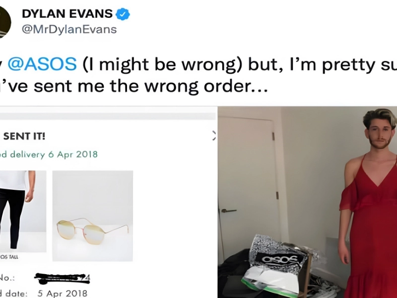 This man went viral on Twitter after posting a picture of an ASOS online shopping error. Evans was looking for sunglasses when he unintentionally ended up wearing a fierce red dress with frills that would turn heads at any summer party.