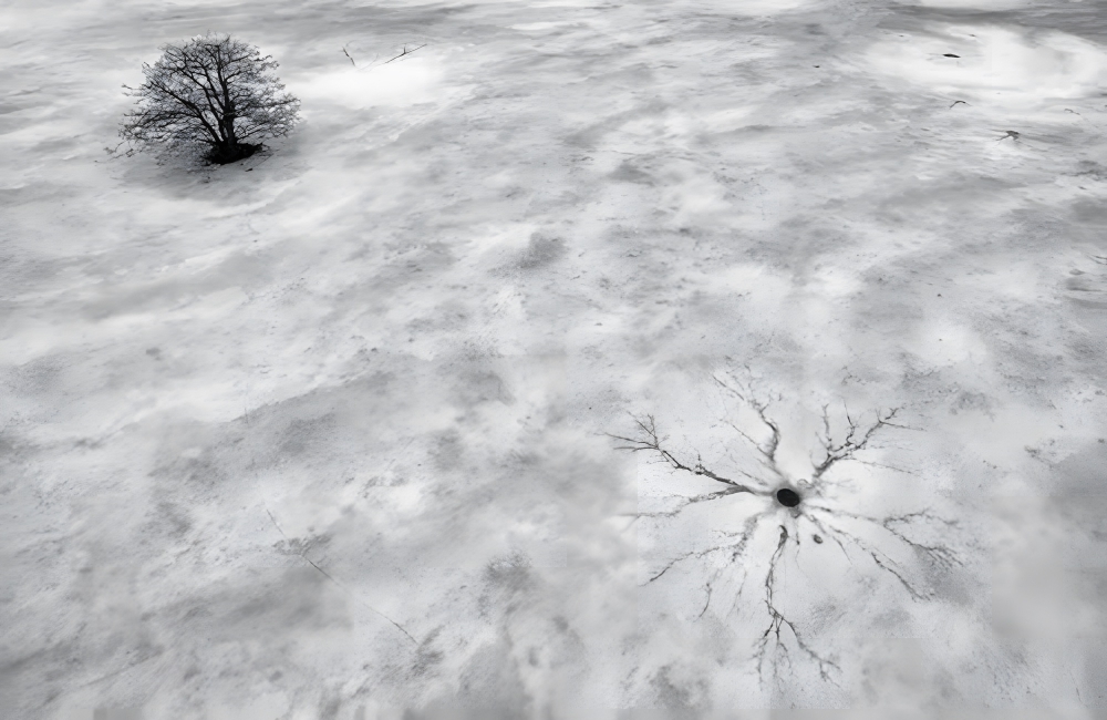 The vein-like remnants of life seem to cast a gloomy shadow over the entire scenery, rendering it black and white, devoid of all color. The white ground looks like ice, opening up the possibility that the tree ended up sinking to its death in the icy waters underneath.