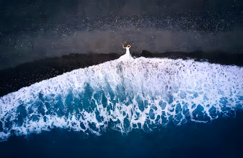 Disney’s Little Mermaid has got nothing in front of this exceptional drone shot blending nature with mankind to achieve the metaphysical. The idea behind this image is elementary: a woman lays on the edge of a beach clad in a white gown as the sea’s foamy waves approach her.