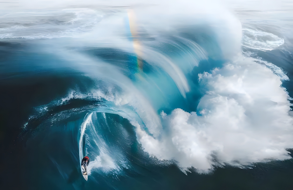 The sheer magnitude of the wave and immensity of the ocean, when compared to the tiny human, truly presents man with a humbling image. The beautiful rainbow formed by the ocean’s water spray acts like the cherry on top, completing the overall animated vibe of the picture.