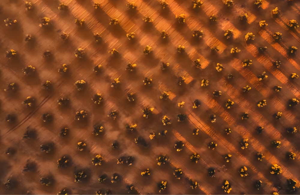 Not all drone images depict the positive, bubbly, and gleeful side of the Earth; some of them are bleak representations of the only certainty on Earth: death. This drone shot is of the latter category, showing a healthy tree and the shriveled remnant of a dead one in the same frame.