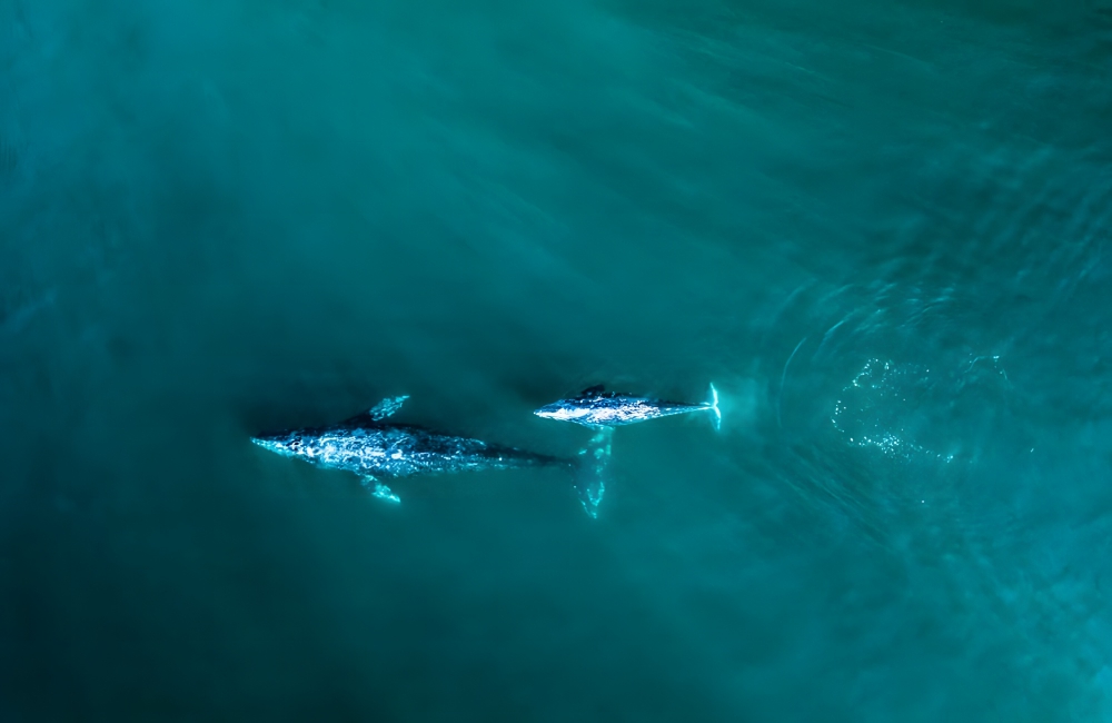 Kyle Munson took this aerial photograph of two gray whales, which appear to be a mother and her calf, judging from the sizes, migrating. The possible drone used might have been the SwellPro Splash Drone 3, a drone that is great near water. The waterproof drone would have been impervious to any sea spray.
