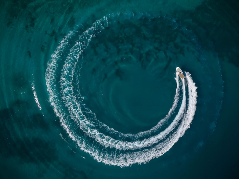 The wake of the boat appears in the water, almost like a string of pearls or a perfect circle. This image may have been captured using a camera similar to the Swellpro Spry, a reasonably priced waterproof drone available at the Swellpro Store for about $987.