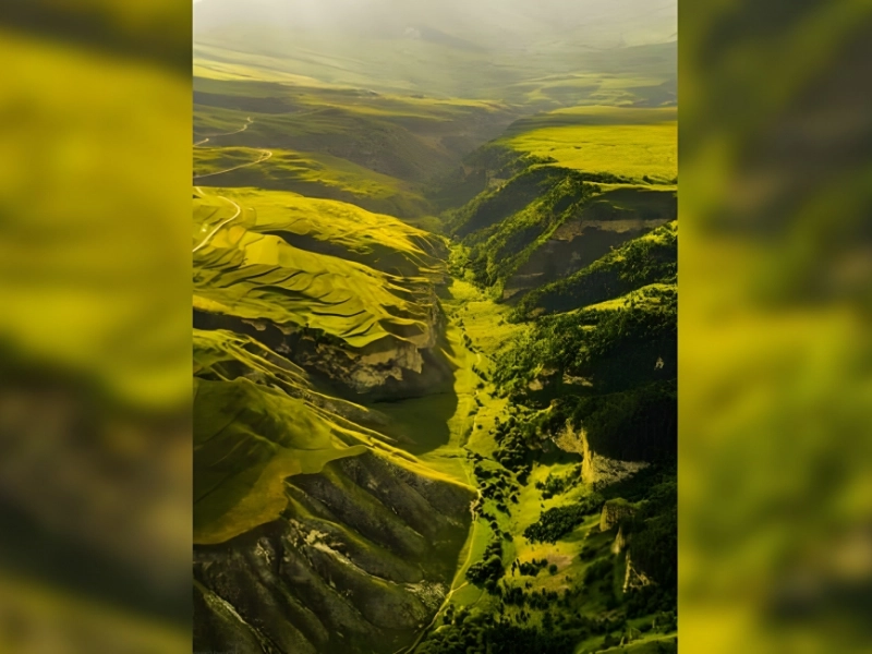 This image was entered into the SkyPixel 6th Anniversary Aerial Photo and Video Contest by social media user @Mikhoshka, and it won an award. The stunning image, “Fields of Gold,” depicts undulating pastures in Kezenoyam, Chechnya. The deepest lake in the Caucasus Mountains, Lake Kezenoyam, is also located in this area.