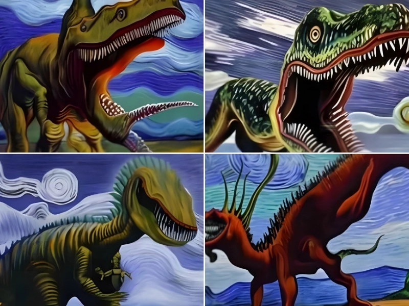 Thanks to EtsyApp. Employed: DALL-E This strange artwork is available on Etsy, thanks to vendor @ArtificialIntelevi. As of late 2023, this download is available for $5.74. With dinosaurs that appear to have been painted by none other than the renowned artist Vincent Van Gogh, it’s undoubtedly a unique series.