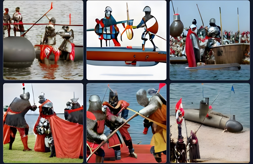 “Knights in a tournament with submarines” was the prompt for this DALL-E series (and what a prompt it was), and this was the result. We can see medieval-clad, battle-hardened knights duking it out on the beach.