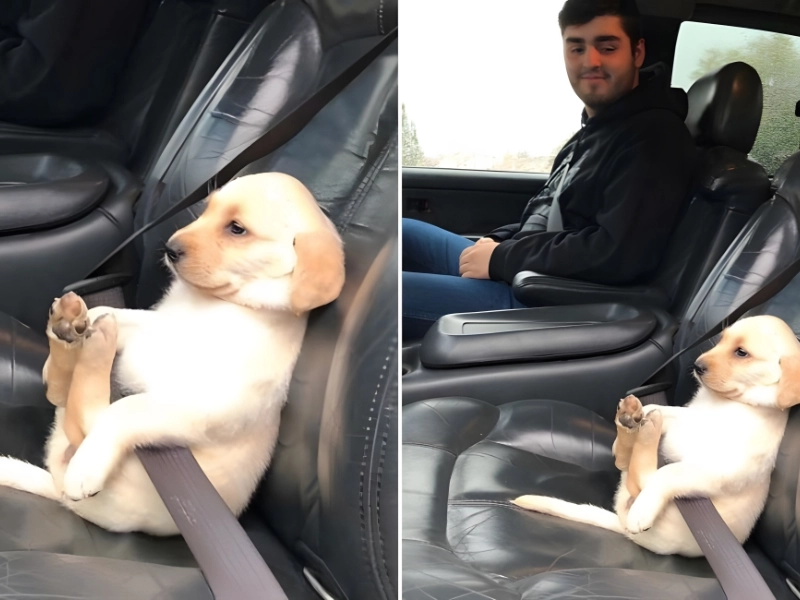 The puppy’s adorable feet, which are standing up in this picture, are the cutest feature. More importantly, for your own protection as well as your dog’s, you should always have them tethered in the car when they are this young.