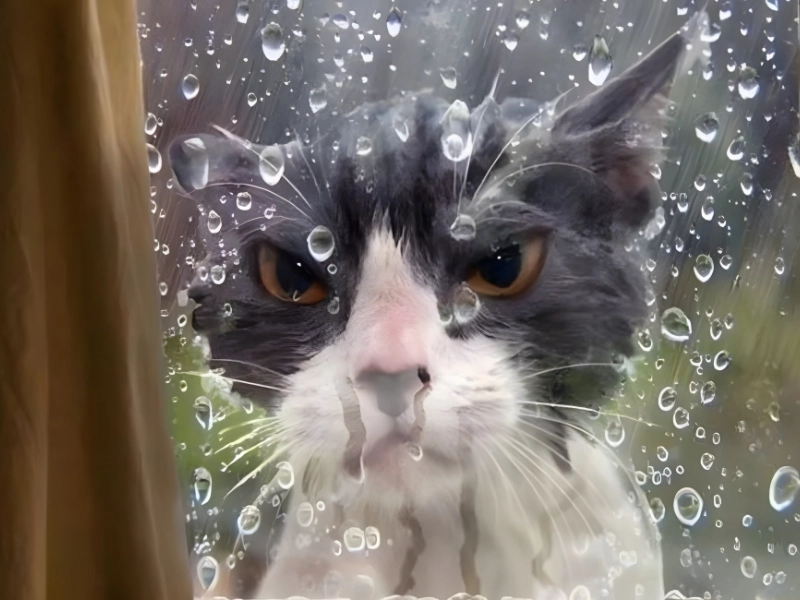 This cat appears very angry about getting caught in the rain, which makes sense given today’s scientific facts of the day. When this Pixar-esque cat returns to the house, it appears as though he is ready to have a harsh conversation with his owners.