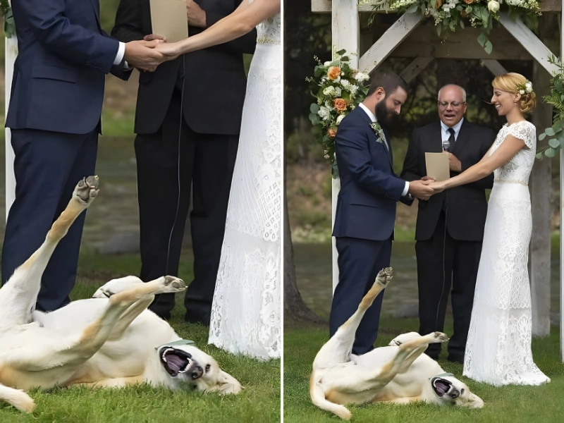 This dog, photographed by the wedding photographer—possibly with a Canon, Nikon, Fujifilm, or other high-end camera—was shown rolling around on the ground carelessly, completely unaware of the formal ceremony going on around him.