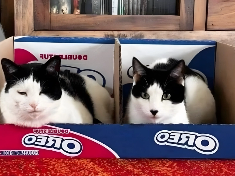 It eventually came to pass. The smaller of the two cats entered one side of the double-stud box, while the larger entered the other. The goal was successfully completed! That’s how we were able to get this amazing picture.
