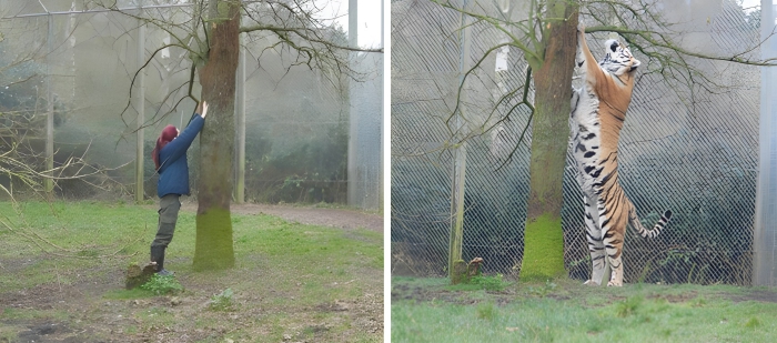 While a small-sized cat would use a cat tree for scratching itself, a Siberian tiger has to use a literal tree as a scratching post. The tiger could easily over power that trainer considering it is double her size.
