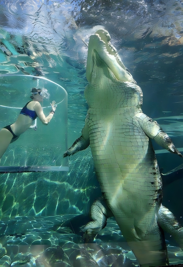 This person in the glass tank probably looks like a tasty afternoon snack to the massive croc. They have the strongest bite out of any living animal, and the saltwater crocodile has been known to attack humans. In murky river waters, people might not be able to see the crocodile and become its next meal.