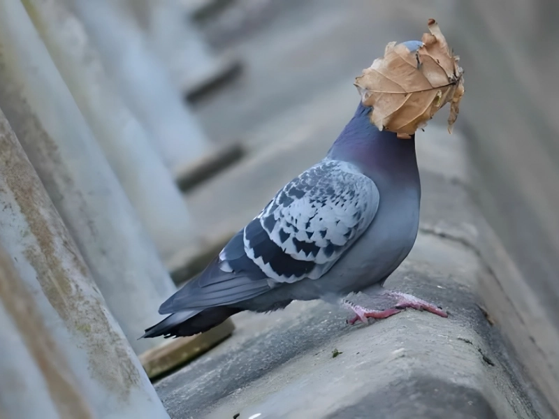 This pigeon was about to take off when he got struck in the face and had his vision obscured by a dead leaf. This image appears to be a small measure of harmless justice, given how bothersome pigeons are to people living in cities on a regular basis.
