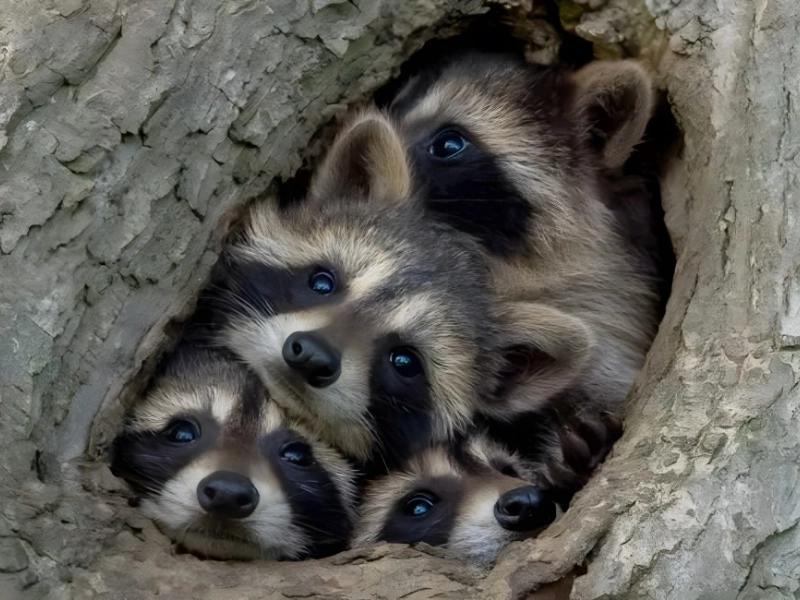 In this image taken by Kevin Biskaborn, a mother racoon and her young are crammed into a small tree area. These Eastern racoons were a tight fit, and Biskaborn claimed they were scuttling over one another to get a better look at what he was doing with his camera.