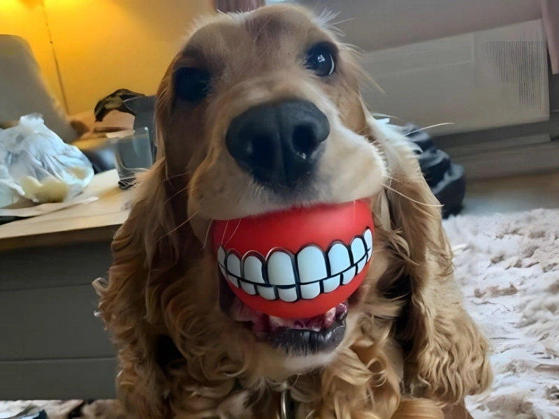 He appears to have a wide, white set of chompers because of the manner in which he is clutching the ball. He appears more silly than normal, and we adore the fact that he is unaware that his carefree gesture is producing such a humorous picture.
