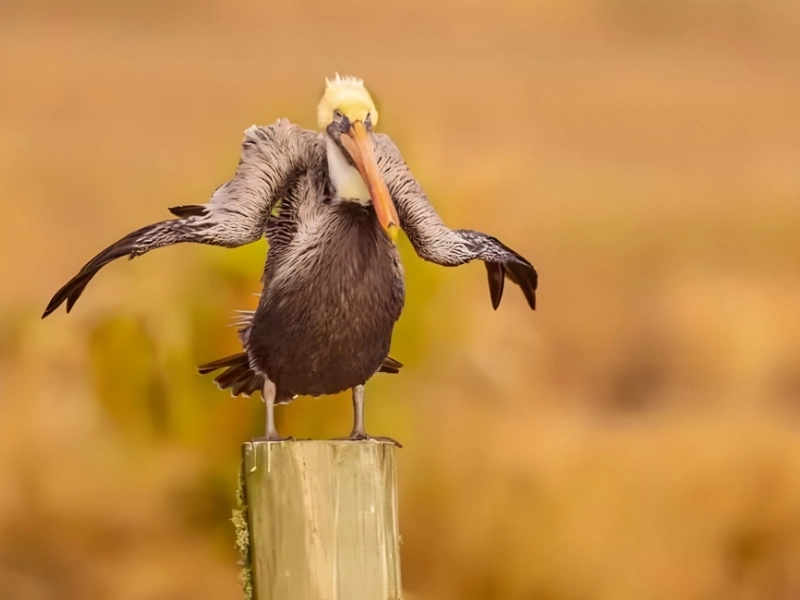 She said the pelicans were rising to their feet, scuffing the rain from their bodies, and going out to fish. Wilson captured this image of a bird that appeared to be recovering after a difficult year because he was in the right spot at the right moment.