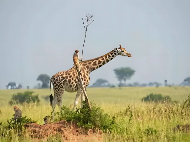 The monkey spotted an opening to grab a ride and jumped onto the friendly giraffe’s back as it passed through. Well, it’s quite an easy way to avoid the scorching Saharan grasses.