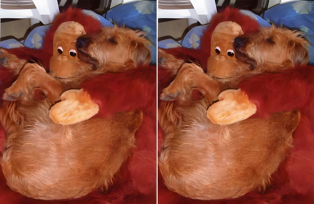 Humans are not the only ones who seek the comfort of stuffed toys; animals are like that too. The first look at this picture may confuse you: is that a dog you are looking at, a hairy stuffed toy, or a combination of both? The truth is quite comforting.