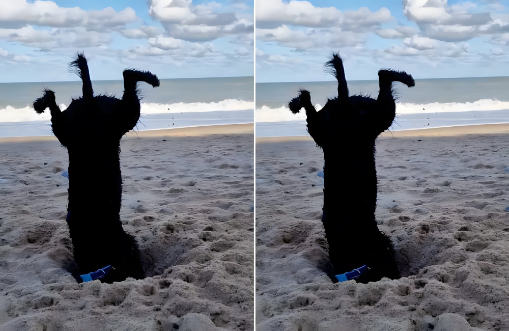 Dogs go berserk when you take them to a beach, digging in the sand happily. But this particular dog seems excited to be on the beach and can be seen exploring away in this photograph with his legs submerged in air. Talk about an energy-filled dog!