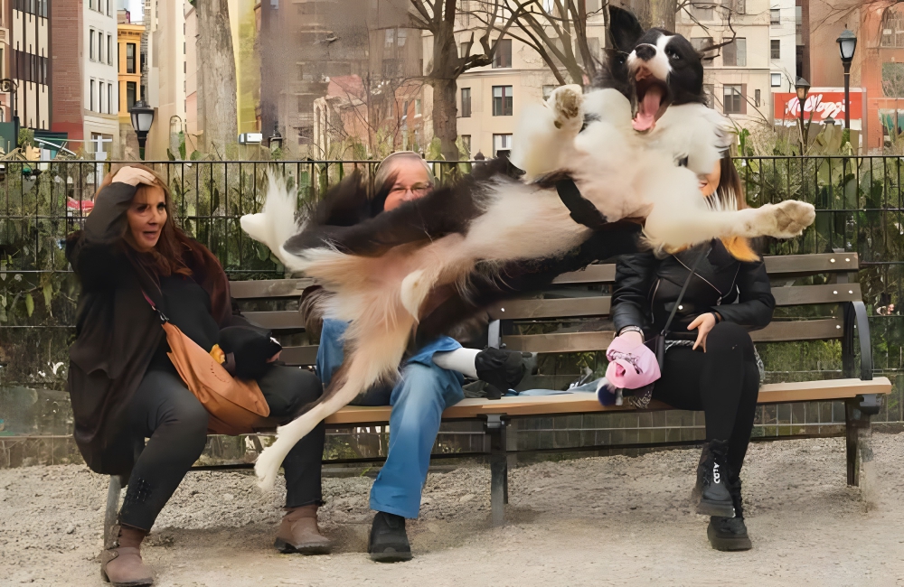 Dog parents agree that you cannot stop a curious and innately happy dog from pouncing about, whether indoors or outdoors. A similar situation is captured by this picture, which shows three individuals sitting in New York, caught somewhat off guard by a happy-go-lucky dog trying to catch a ball.