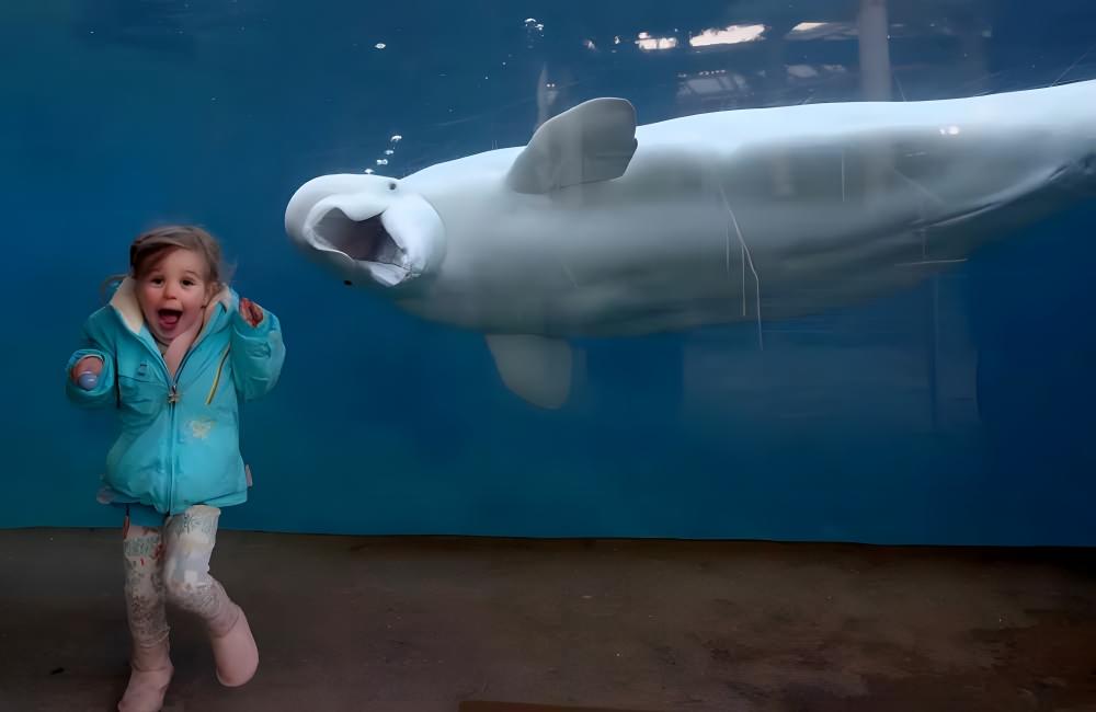 This photograph is a similar memory that went on to become a widely acclaimed picture for everyone around the world. The little girl’s reaction is surely something to behold as Juno, the 15-year-old male Beluga whale, approaches her to pose for the photo!