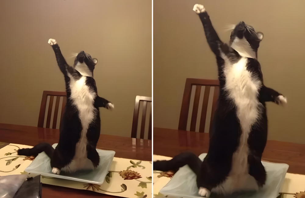 This black-and-white cat is really feeling the music, as he or she is ready to party like it’s the eighties. This adorable photo was snapped on-the-fly, and it features a kitty looking like she’s in the middle of dancing.