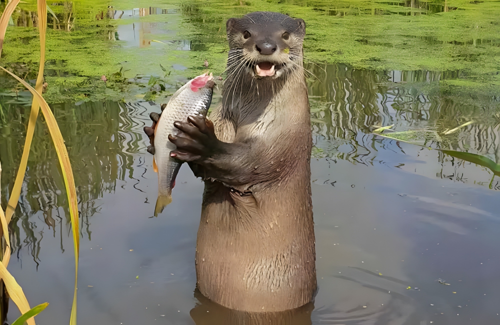 As you can see here, this river otter, one of the submissions to the contest, is not too keen on people trying to communicate with him while he’s holding his fish. He’s glaring at the camera, little fangs bared to protect the catch between his massive paws.