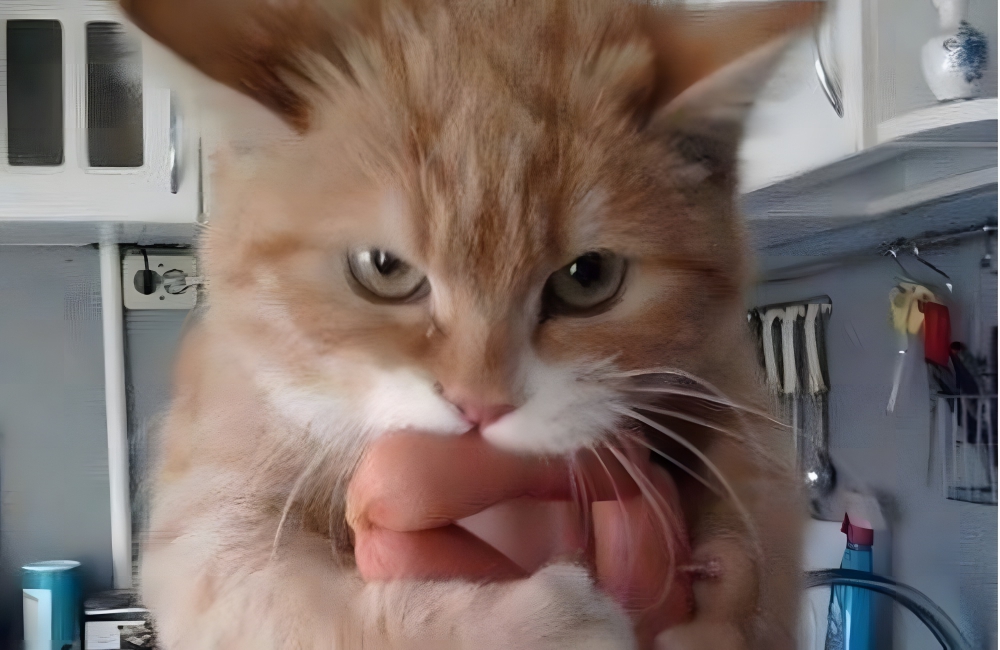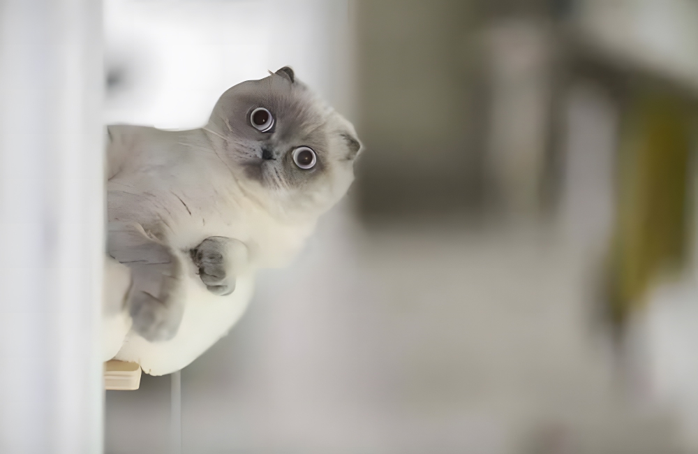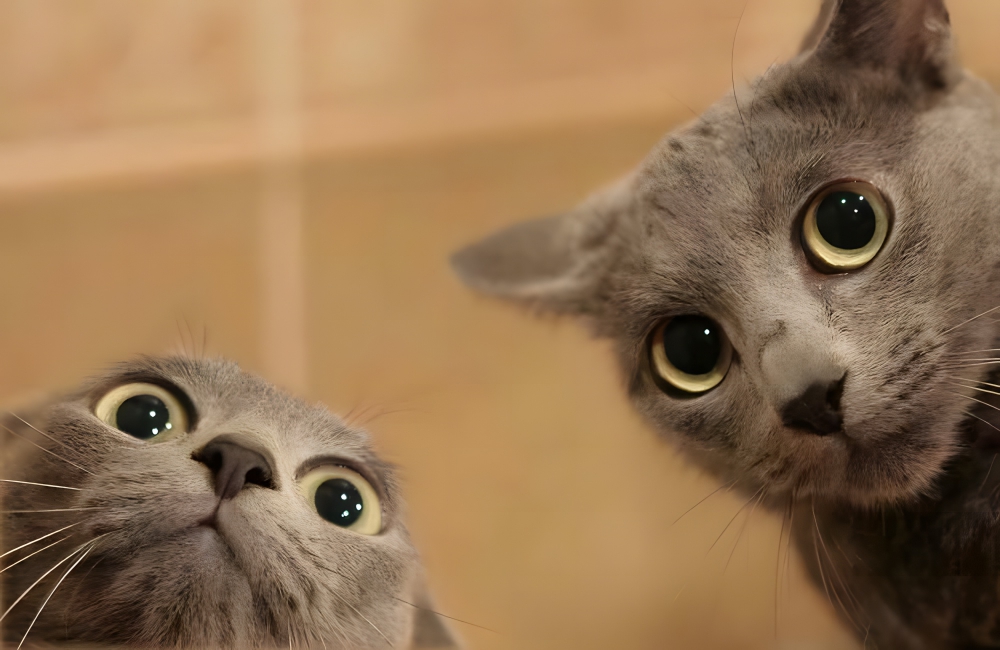 Cats don’t usually do too well when they are caught by surprise, usually reacting with suspicion, fear, or an attempt at a bite. These two gray cats were caught red-handed, doing what, we don’t know.