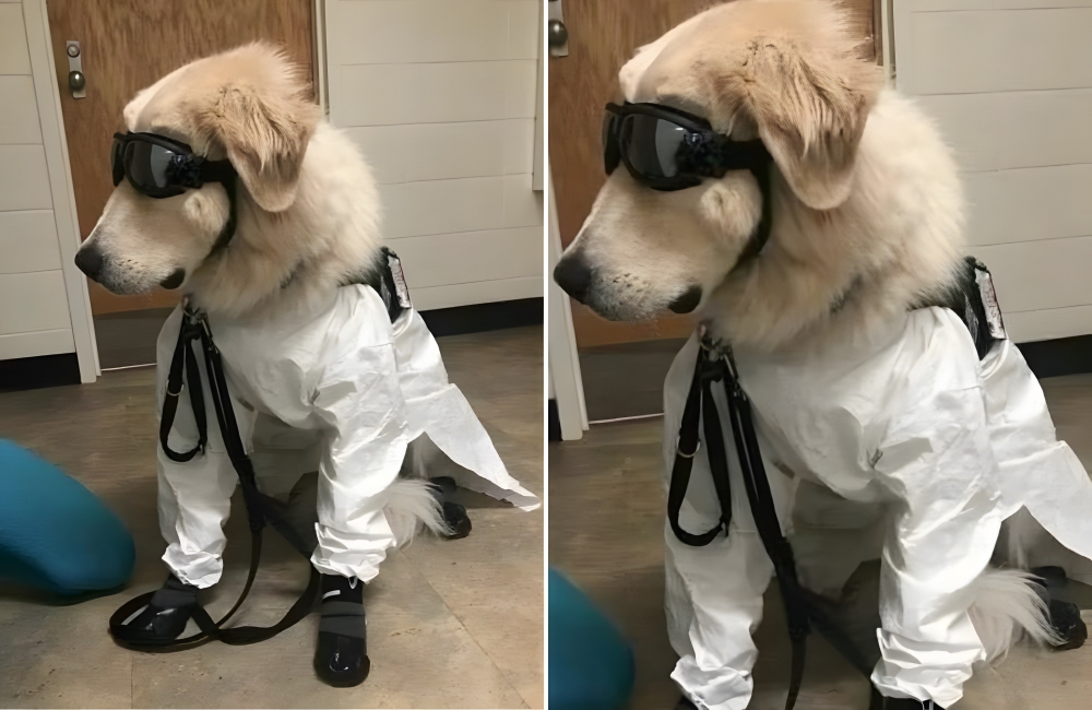 These dogs are ready to go, even if they need to be kitted out in safety gear to do so. This picture features a dog ready to help his owner with her lab work in school. Look how professional he looks; he could be a top scientist at DuPont for all we know.
